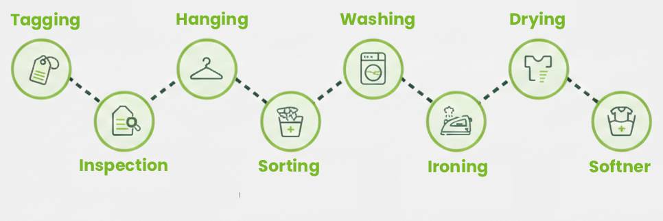 High-Pressure Steam Ironing (Wash & Iron Service) – Home irons and coal irons can cause shine marks and damage fabrics. We use high-pressure steam with a Teflon-coated iron to avoid any damage. Further, steam sterilization, recommended by the CDC and WHO, is the safest way to sanitize clothes.